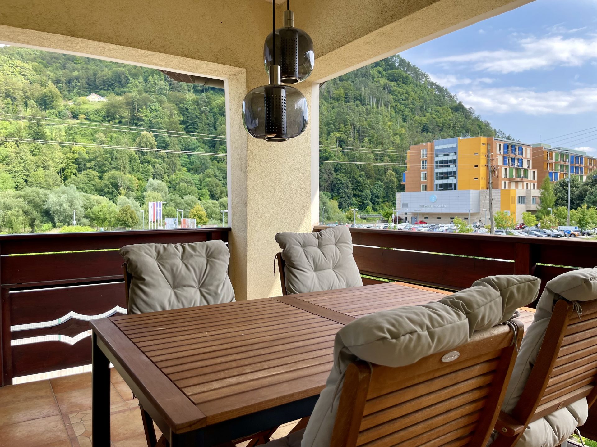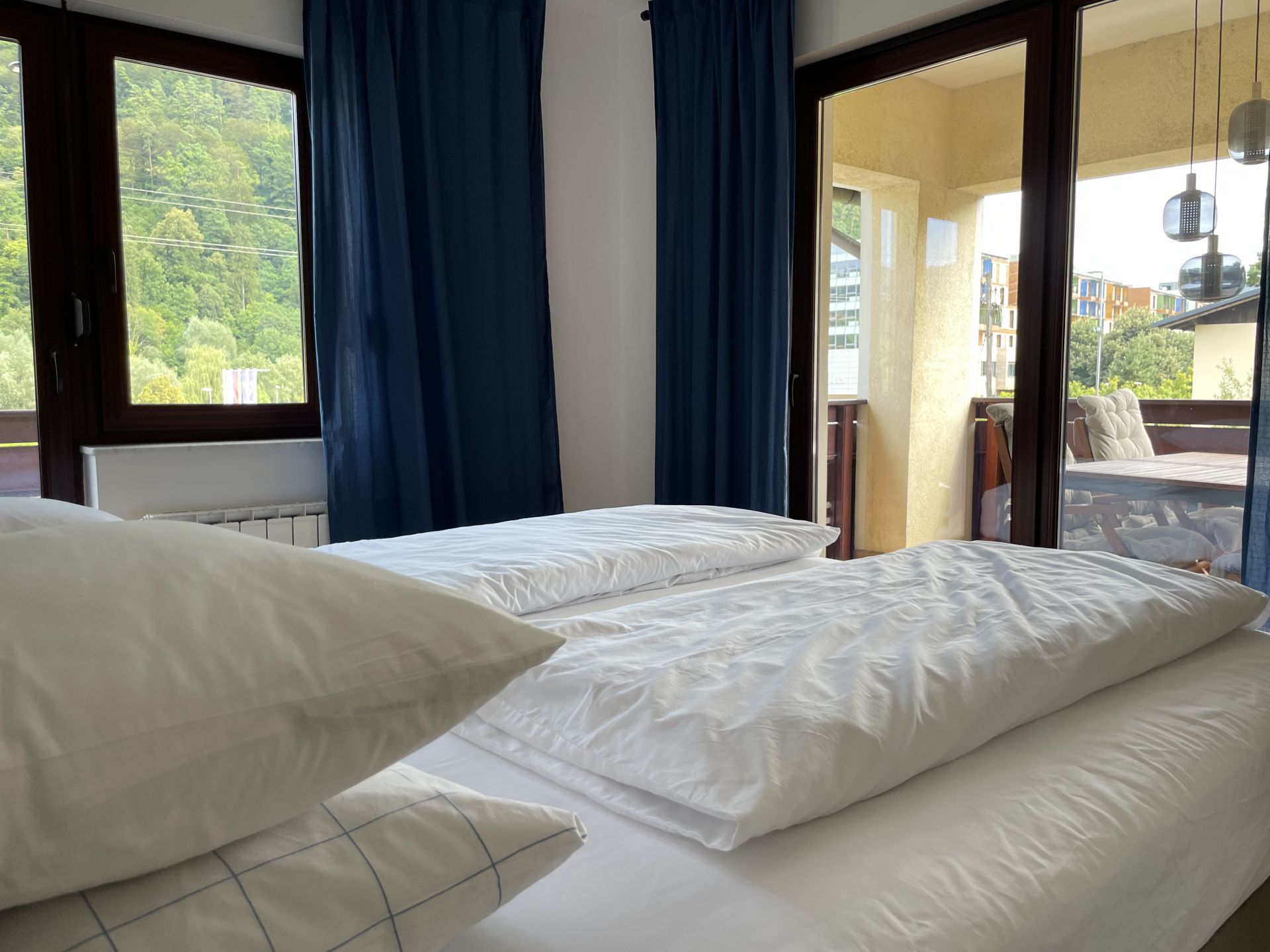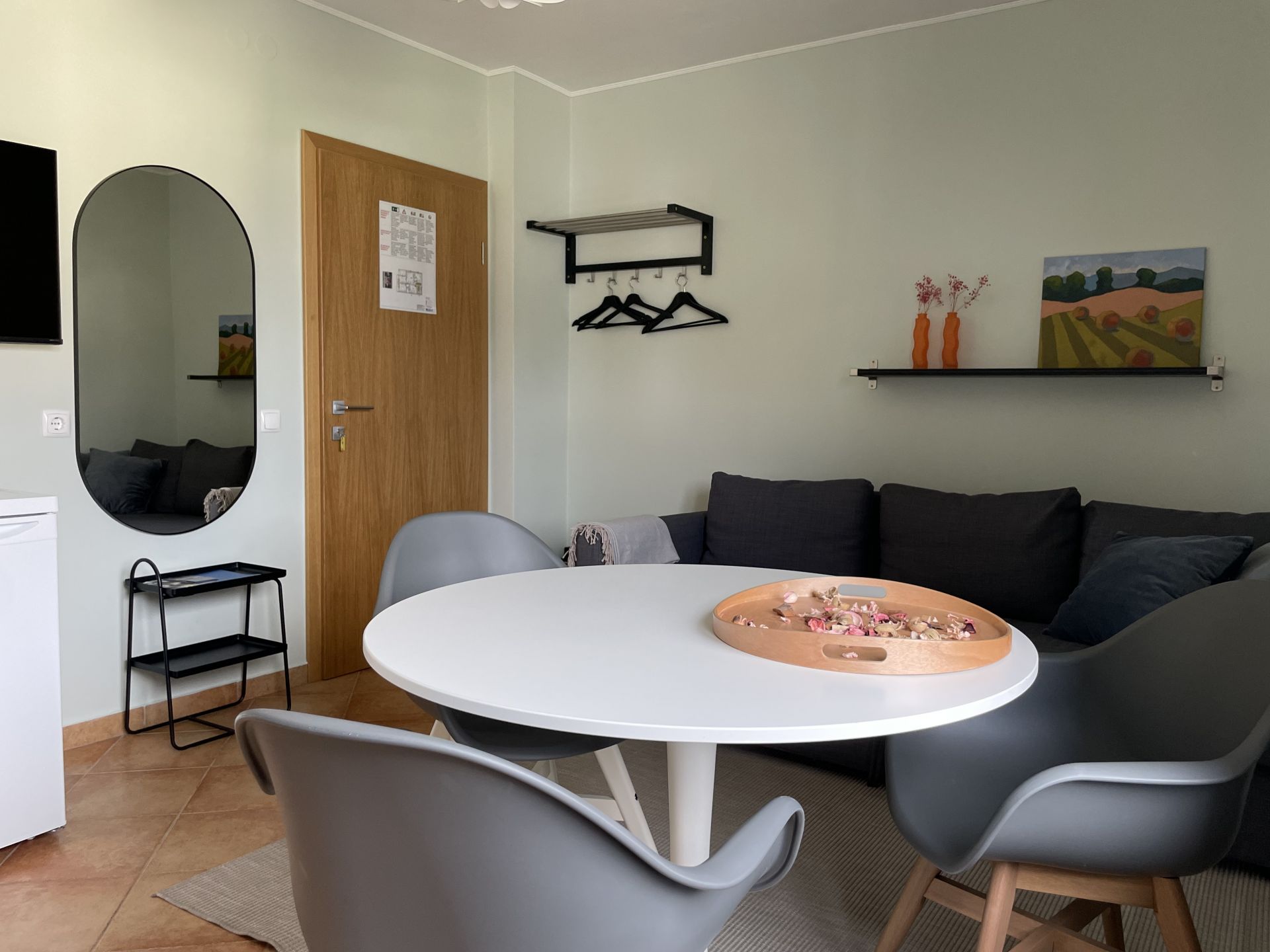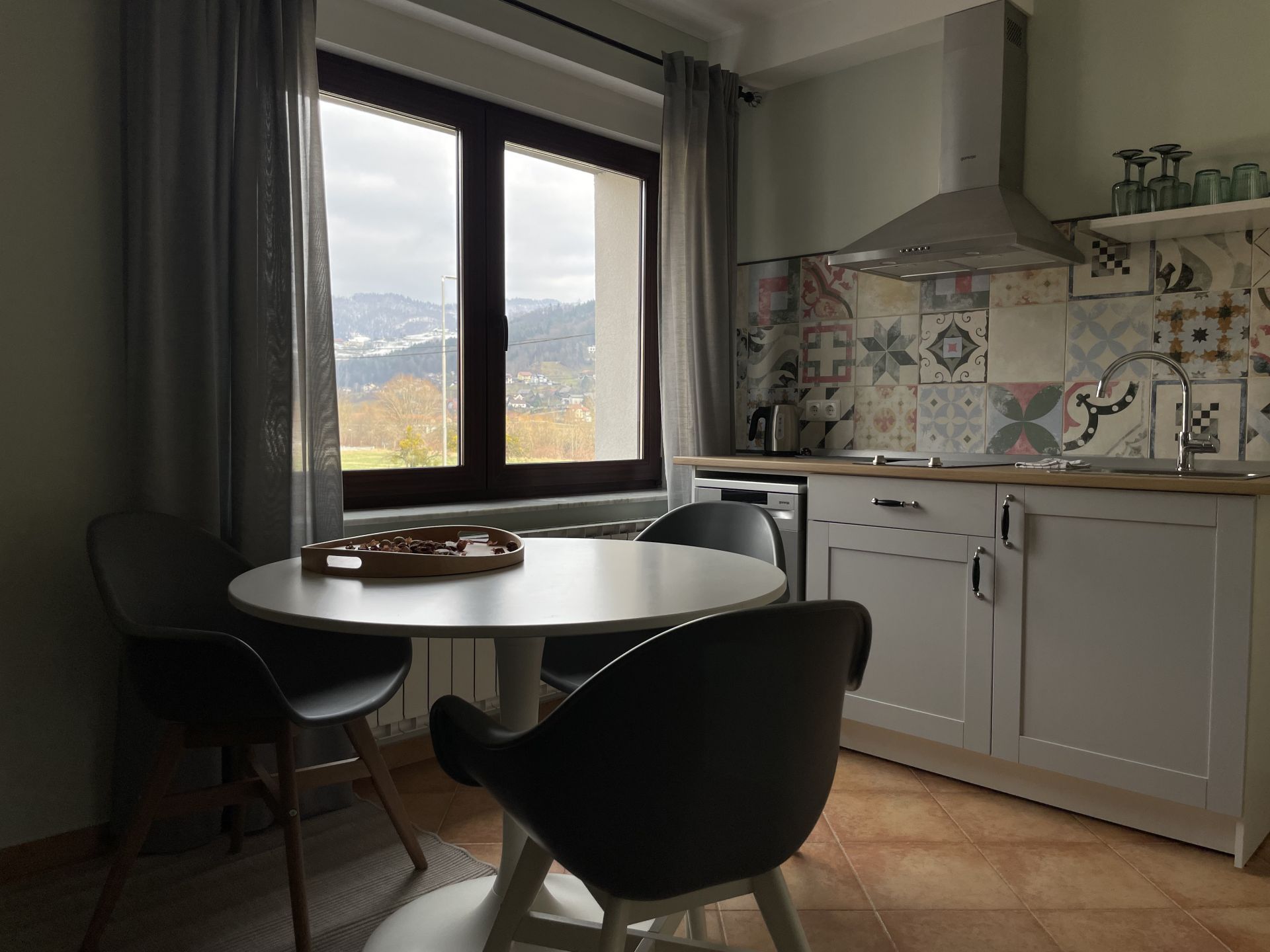 Gostom je na voljo udoben apartma z zasebnim balkonom, kjer lahko uživate v jutranji kavi in panoramskem pogledu na okoliške hribe.