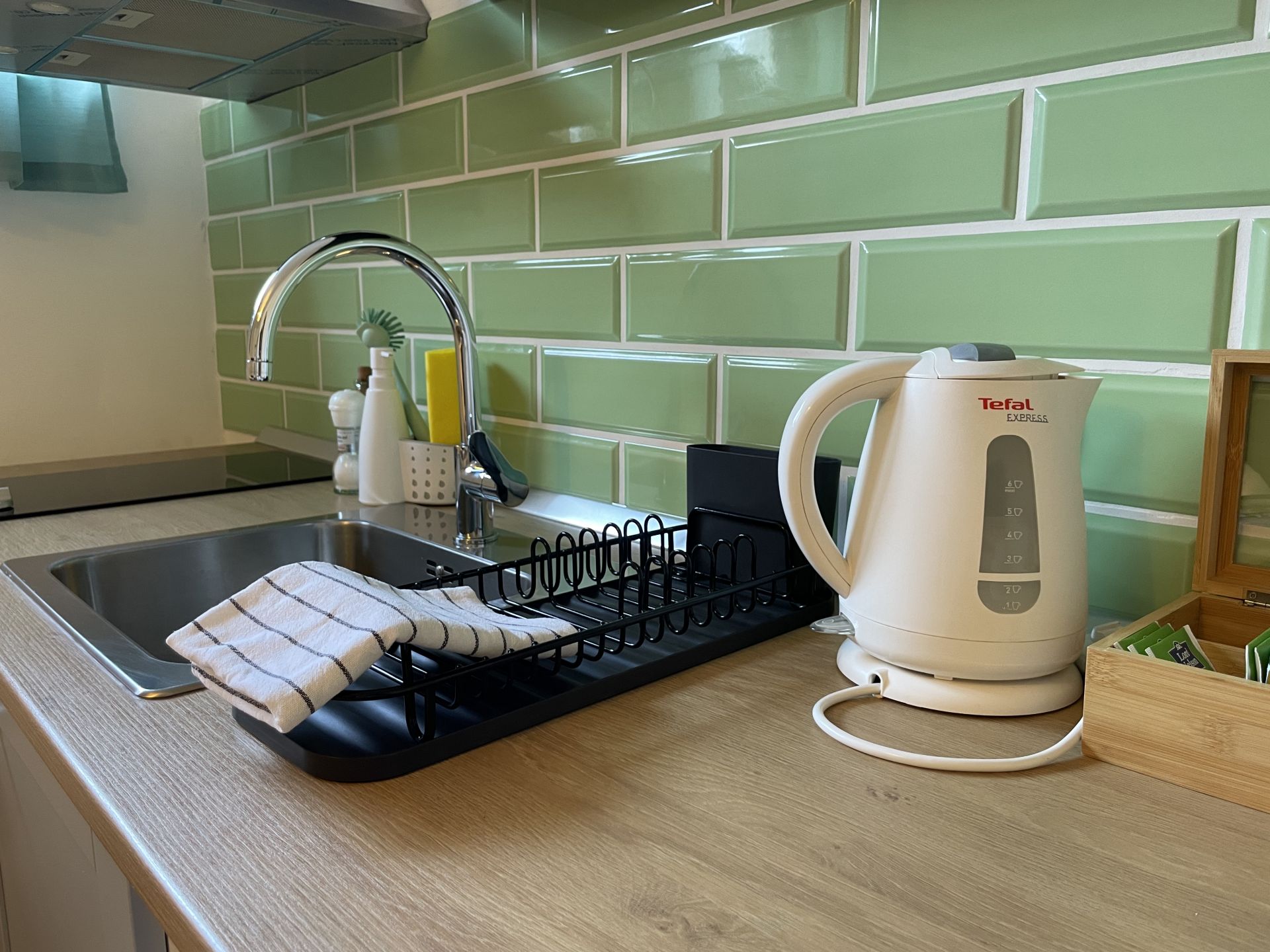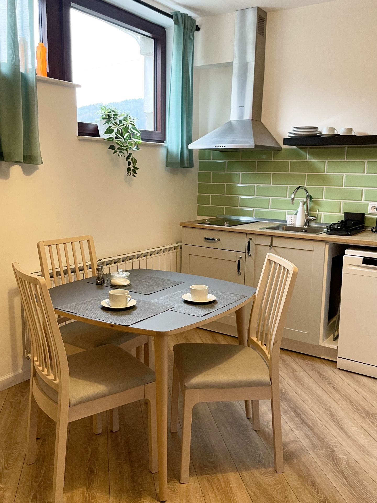 Kuhinja je popolnoma opremljena – na voljo so štedilnik, pomivalni stroj, hladilnik z zamrzovalnikom, aparat za kavo, grelnik vode, turška džezva in vsa posoda.